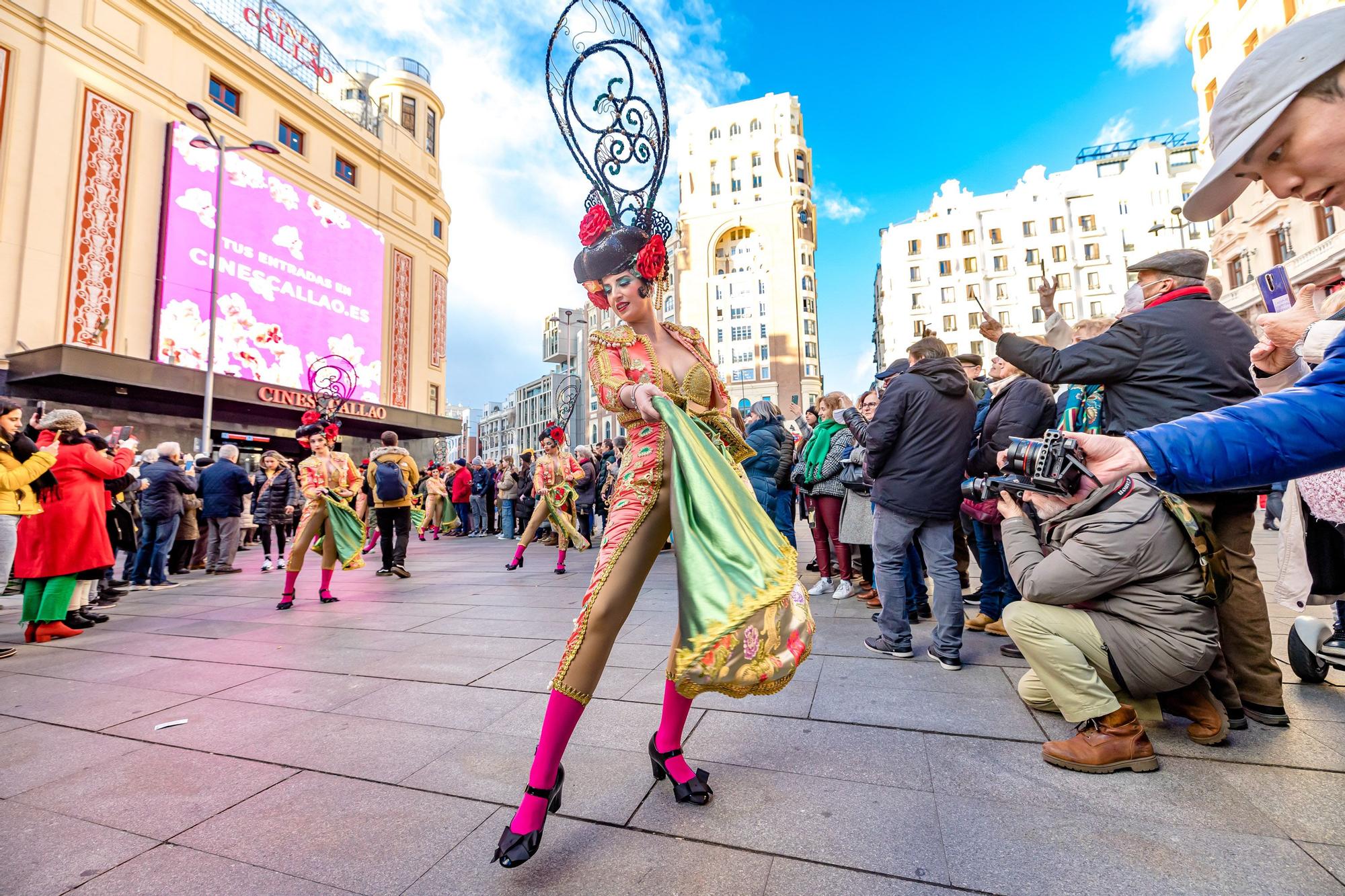 Torrevieja da un paso más allá en la promoción de su oferta turística durante la semana del turismo con la celebración de Fitur 2023. Para ello, salió el pasado miércoles durante unas horas del pabellón de Ifema y tomó las calles del centro de Madrid para mostrar uno de sus principales atractivos, como es su carnaval, declarado fiesta de interés turístico. Durante una hora y media, más de 100 personas, ataviadas con indumentaria y música que fusionaron las raíces del carnaval de Brasil, la elegancia del de Venecia y el humor de las chirigotas de Cádiz, y desfilaron por la Gran Vía madrileña, la plaza de Callao y la calle Preciados.