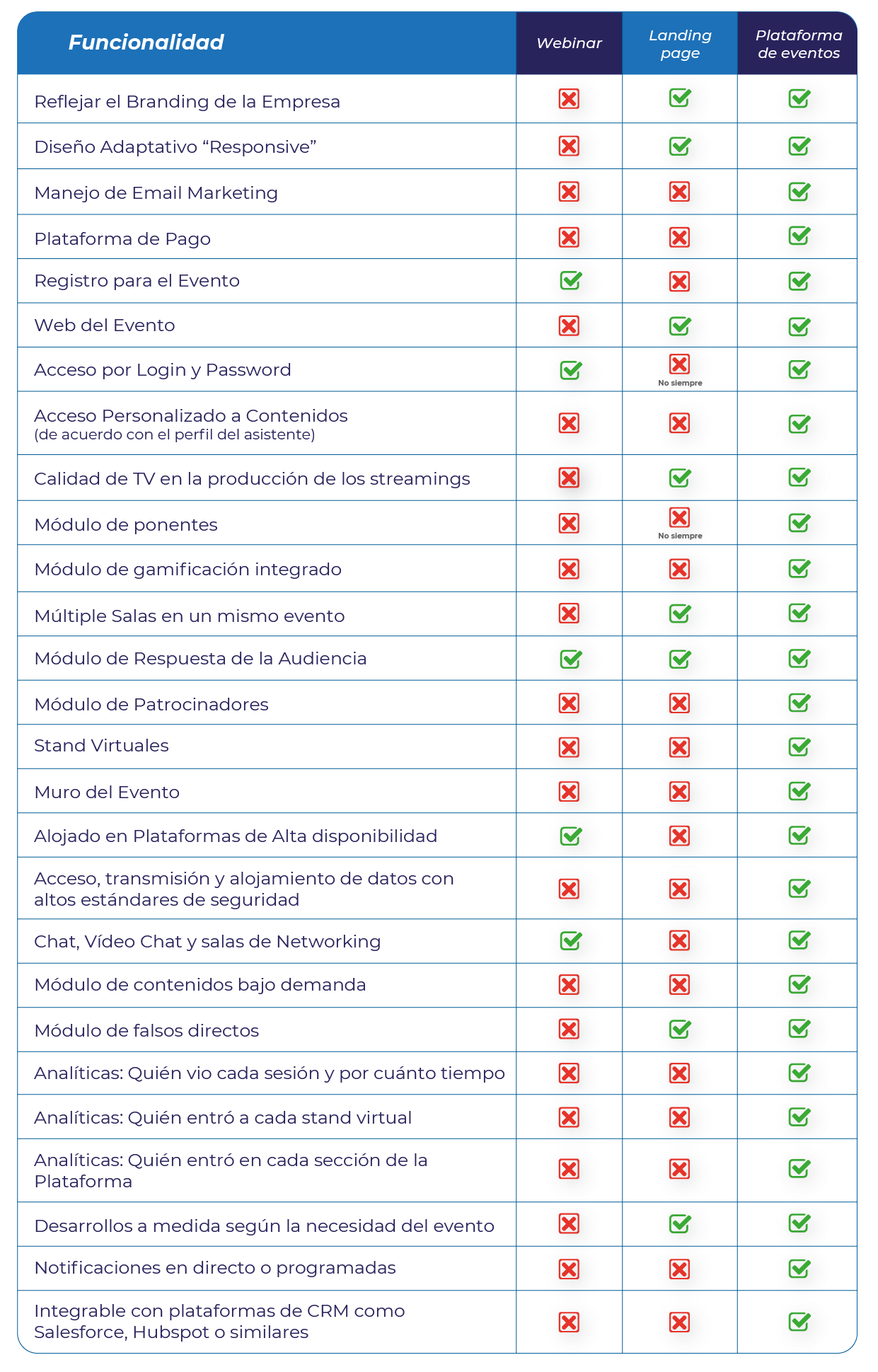 Esta tabla debería servir como guía para escoger la solución de software más apropiada para realizar un evento, considerando algunos aspectos fundamentales como: Branding, seguridad de datos, complejidad del evento y presupuesto. Es importante destacar que en cada una de las soluciones existen muchas opciones y que ninguna es la solución definitiva para todos los tipos de eventos virtuales o híbridos a desarrollar. Es importante hacer un estudio de las necesidades y evaluar el alcance de la solución que mejor se adapte a dichas necesidades.