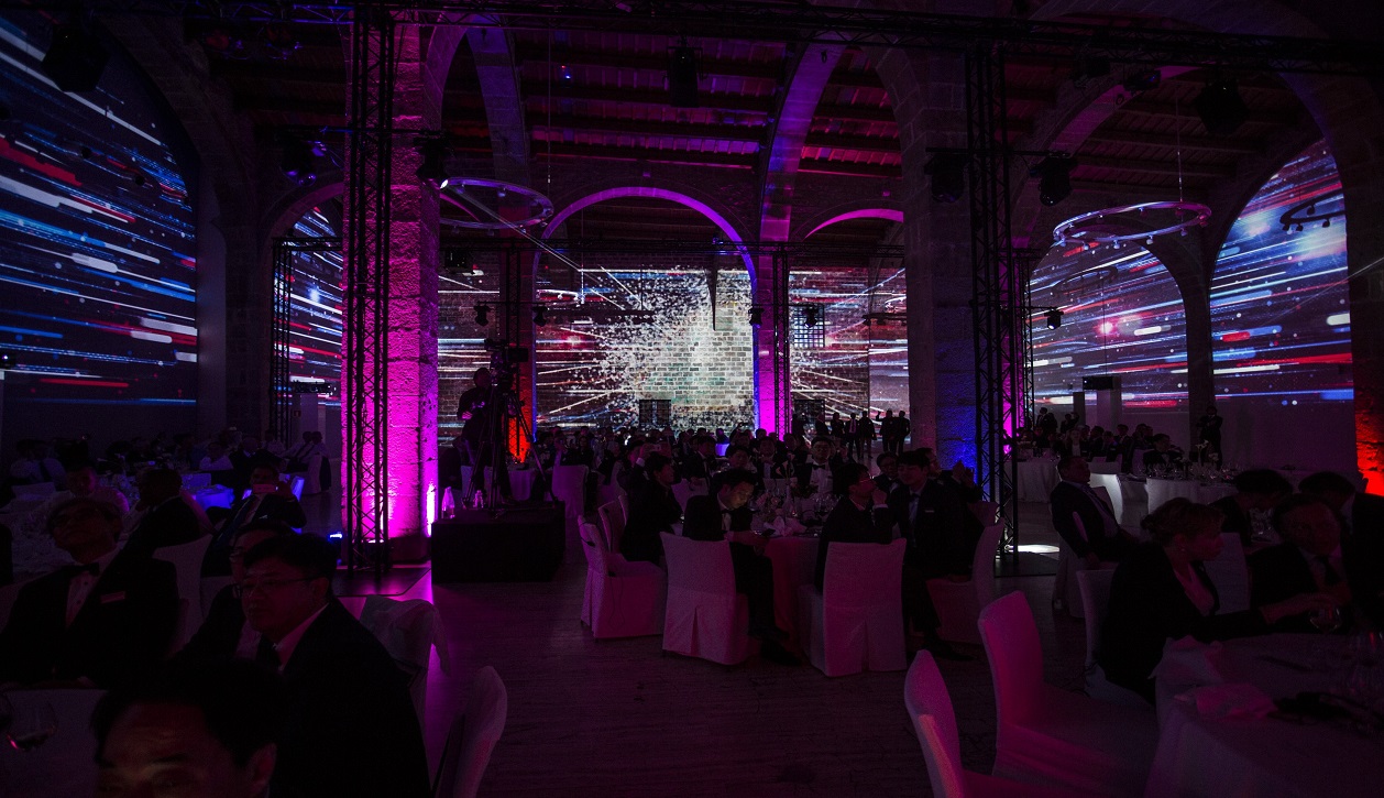 Para la cena de gala, la sala se vistió de magia ofreciendo una coreografía que, partiendo enérgicamente del corazón azul de la sala, el escenario central, sincronizaba la música con efectos de luz y cuidadas proyecciones mapping 360º en todas las estancias del espacio, que eran lanzadas hacia todas las paredes de la sala desde el escenario central y cuyo efecto se veía multiplicado al proyectarse sobre la original fachada de muros y bóvedas. Además de los discursos, se entregaron los premios al equipo.