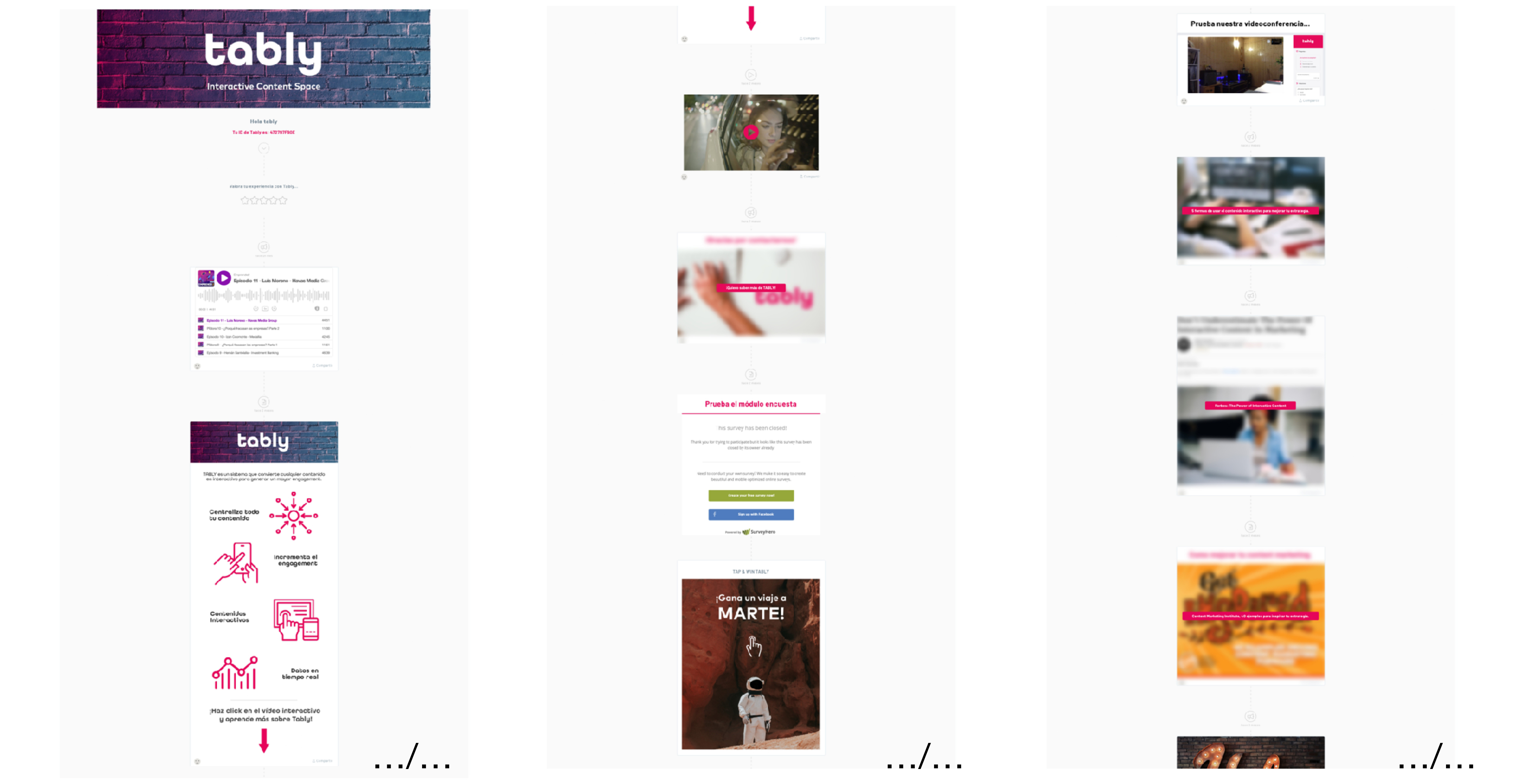 Yumiwi nos ofrece Tably, una plataforma que unifica diferentes contenidos (vídeos, pdfs, keynotes, posts, el propio feed de twitter…), los digitaliza en un mismo lugar y los transforma hacia la interactividad “potencionando su eficacia”, según nos dicen. ¿Qué significa esto? Que pensando en la participación del usuario Tably le permite jugar con todo contenido, seleccionar qué le interesa o qué quiere ver y aquello que no. Dependiendo del objetivo, el contenido se transforma de un modo u otro. Si el objetivo fuese de promoción (algo muy habitual en eventos de punto de venta) se usaría para que a partir de la propia interacción el usuario gane cupones, canjee premios, es decir, tenga una relación e implicación todavía más fructífera. Al albergarse todo en un mismo lugar se puede acceder de manera sencilla con QR o invitación. Y de por sí su uso supondría datos de la interacción de los usuarios, por lo que es una herramienta con la que conseguir extraer datos de la audiencia de manera indirecta, incluso obligándole a contestar preguntar para desbloquear contenido. La siguiente imagen refleja cómo sería el desglose de Tably con todos los contenidos unificados de manera que el usuario pueda interactuar con ellos. También existe la posibilidad de realizar una demo.