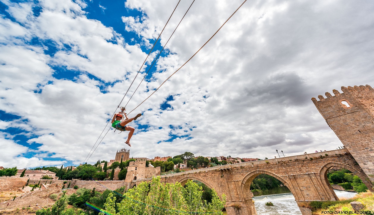 Volando en tirolina. Otra opción es sobrevolar el río Tajo, con Toledo al fondo, liberando endorfinas en la tirolina urbana más larga y rápida de Europa, nada menos que 180 metros en 30 segundos. Aprovechando el escenario natural del río junto con la monumentalizad de fondo de la ciudad el salto se puede inmortalizar con un recuerdo en foto y video GoPro. Además, Fly Toledo, la empresa que gestiona esta tirolina en la ciudad, también organiza saltos nocturnos con el puente de San Martín iluminado.