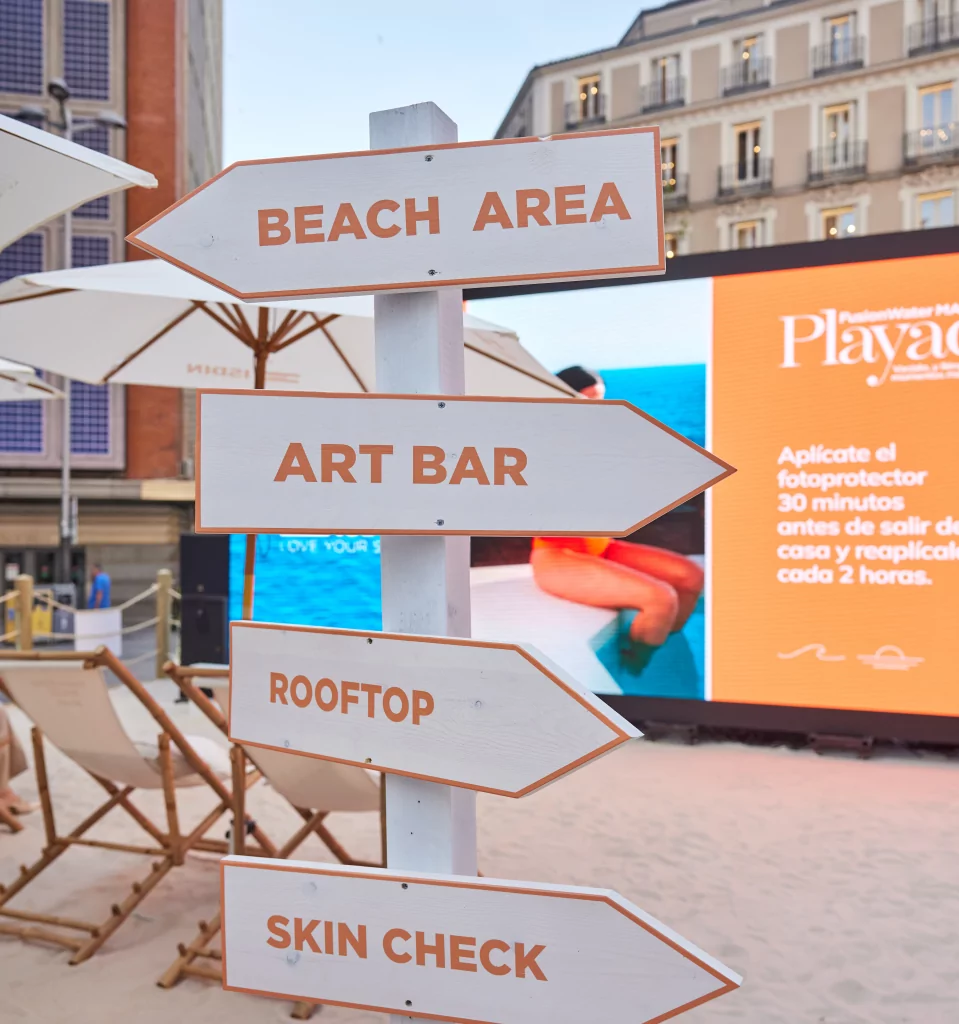 El equipo creativo desarrollo un concepto con lo que nos pedía el cliente de tener una playa en Madrid sobre una plaza emblemática como lo es Callao. Uniendo ambas palabras se formó el concepto de “playao”. El evento tenía un claro mensaje: todo el mundo debe foto protegerse. Fue un evento de lanzamiento de la nueva fusion water magic. Una campaña de concienciación sobre la importancia de utilizar el protector solar.