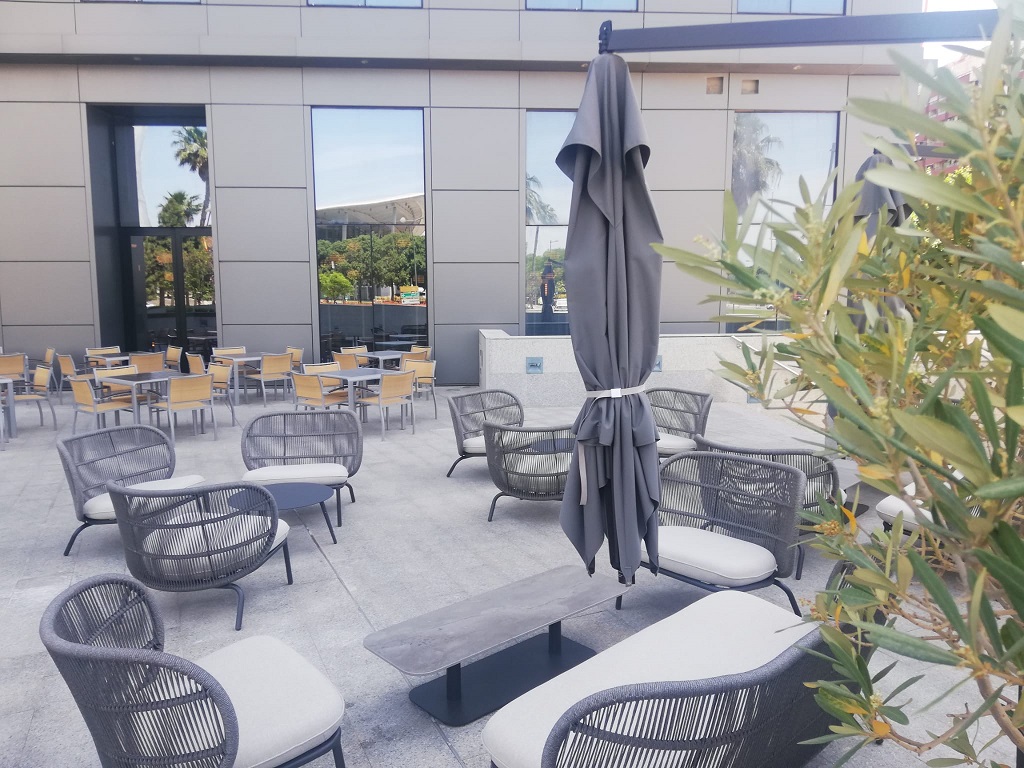 El hotel, ubicado en el centro de la ciudad (Av. de las Cortes Valencianas, 52), tiene dos terrazas, una pegada al Bar Oval (Terraza Oval) que está al lado del Lobby y la recepción, y otra en la primera donde está la piscina exterior y que estrenamos ahora en breve (Terraza Piscina). Sus terrazas: ‘Terraza Oval’: con capacidad total para unas 70 personas y ubicada junto a nuestro Bar Oval del Gran Lobby. Espacio que ya está abierto al público tiene como principal función ofrecer al cliente un espacio para tomar algo después de un día largo de ocio o trabajo y también para eventos que requieran un espacio al aire libre (un coffee, un cocktail, un finger buffet, etc.), y la ‘Terraza Piscina’: espacio multifuncional, por un lado, para refrescarte tomando el sol junto a nuestra nueva piscina exterior o al atardecer para tomar algo mientras se pone el sol. Además, se explotará para eventos privados hasta 350 personas al aire libre durante todo el año. “Este verano ya tenemos en agenda siete conciertos al aire libre que se darán en este espacio”, nos señalan desde el hotel.