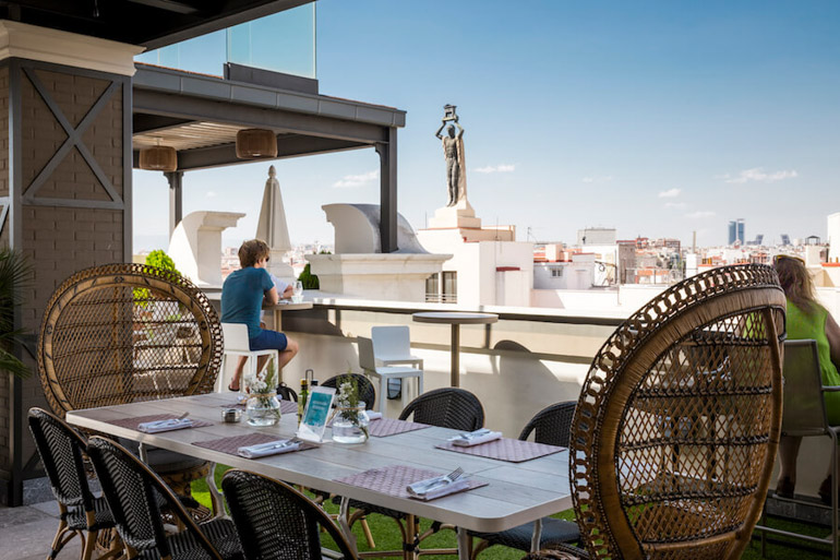 Y lo de impresionante no es hablar por hablar: esta terraza que sorprendió a Madrid en 2019 corona el enorme edificio del Riu con una altura de más de 117metros, lo que permite tener una vista, de verdad panorámica, de la ciudad. De Madrid al Cielo es el nombre que han rescatado de los años 80 para definir las dos zonas de la terraza unidas por una sorprendente pasarela de cristal no apta para cardiacos, que sigue arrasando en Instagram. Pero aparte de la impresión, el Rooftop Bar 360 es un espacio cálido y confortable, con detalles arquitectónicos y decorativos que se suman al chic general del hotel.