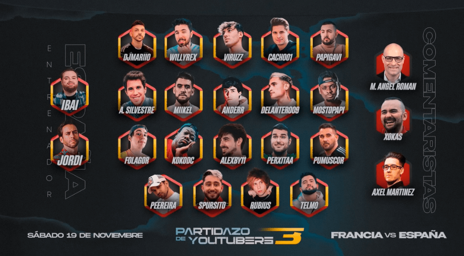 La semana que viene empieza el Mundial y para ir calentando motores, los aficionados del fútbol podrán vivir -en presencial u online- un encuentro que estará protagonizado por unos actores poco habituales (al menos, en el terreno de juego) algunos de los streamers más conocidos de nuestro país como: Rubius, Willyrex, Alexby, Ander, Cacho o Folagor, entre muchos otros. El Partidazo de Youtubers 3 será este sábado día 19 y será una edición que por primera vez alcanza el panorama internacional y enfrentará a creadores de contenido de dos de los países que participarán en el Mundial: España y Francia.