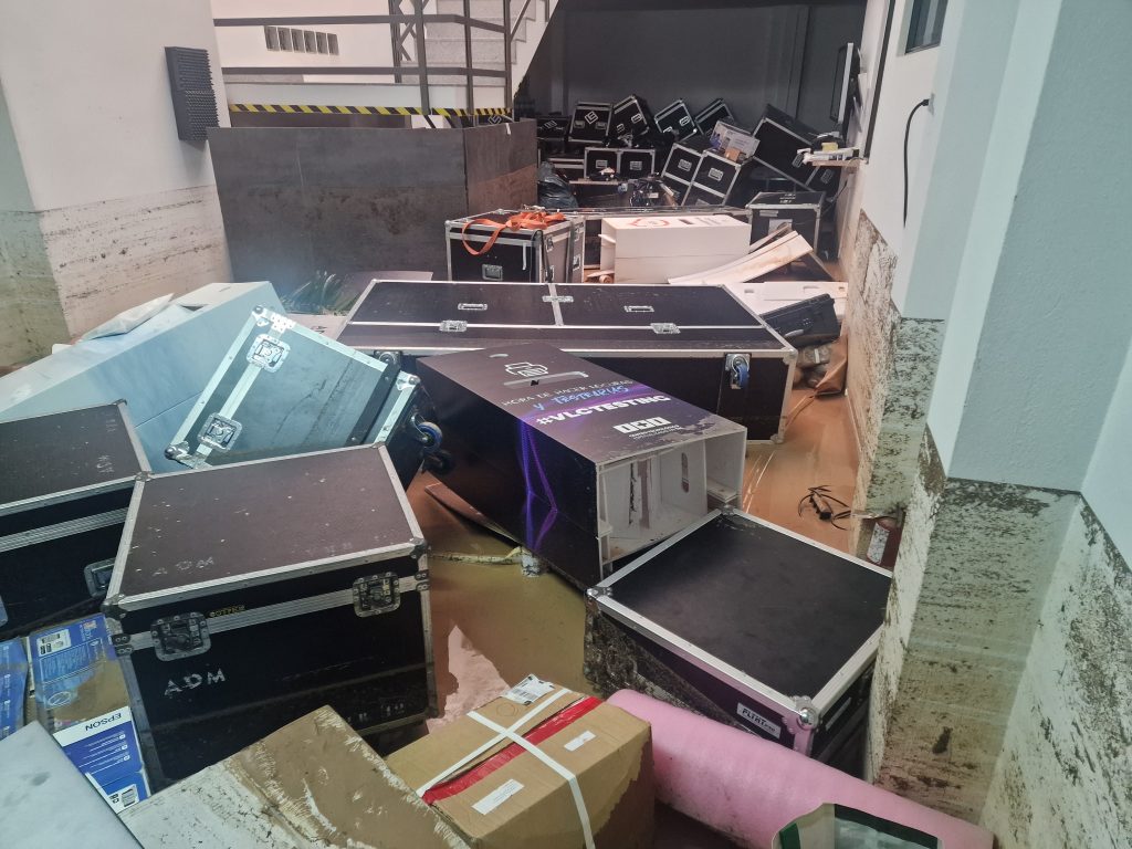 Su almacén de Requena de 8.000 m², en 15 minutos se inundó 1m y medio de agua destrozando telas, tarimas, decorados… Todo tipo de materiales acabaron estropeados, algunos de ellos incluso los tenían preparados ya para eventos de final de año que han tenido que derivar a otras empresas del sector para que puedan llevarse a cabo.