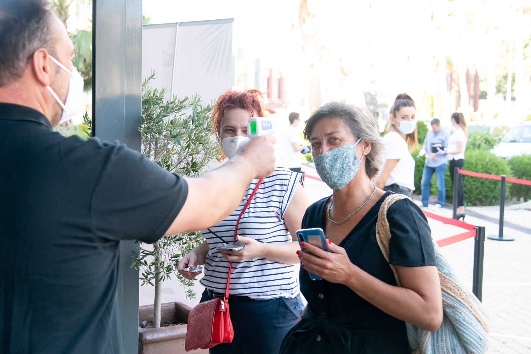 5.Tomar decisiones importantes de manera consensuada de cómo se garantizará la seguridad. A la hora de preparar el Plan de Actuación del evento en contexto Covid y con la ley de la Comunidad de Madrid y las recomendaciones del ICTE siempre sobre la mesa, hemos tenido que tomar decisiones clave. Desde el 6 de julio de 2020 y “mientras la situación epidemiológica lo aconseje” la Comunidad de Madrid aumentaba el aforo permitido al 75% con un límite de 300 personas sentadas para lugares cerrados y de 1000 personas sentadas al aire libre, por ello se estableció el save the date el día 7 con un máximo de 150 asistentes. Otra decisión importante fue situar un punto de control de temperatura en el acceso al evento (junto con un protocolo de actuación en caso de sintomatología). La temperatura corporal debía ser inferior a 37,5ºC para poder acceder.