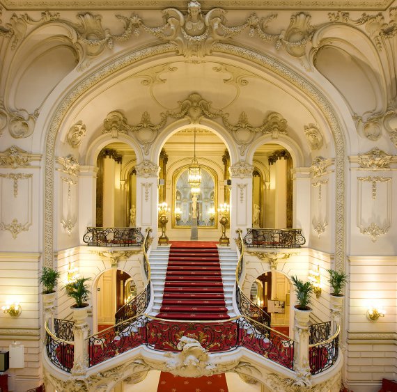 Patio de estilo ecléctico afrancesado en el que destaca la vidriera de la casa Maumejean y la gran escalinata modernista diseñada por López Salaberry . Un espacio icónico perfecto para recibir a los invitados en un entorno único e irrepetible.