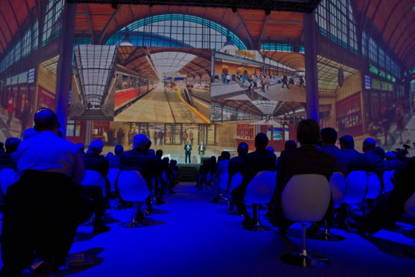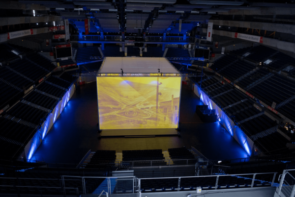 Montaron el evento en el WiZink Center, y al llegar los asistentes solo veían una cara del cubo con, delante, un escenario y asientos, así que los invitados pensaban que vivirían una presentación ‘normal’. Se sentaron los 400 invitados y Rafael del Pino subió al escenario y dijo “llevo años contándonos lo que es la empresa hacia el mundo exterior, pero lo que quiero es abriros el corazón de Ferrovial”. Entonces, con motores, subía la pared que estaba detrás del escenario, y los invitados entraban al cubo donde (tras volver a bajar esta cara del cubo) una proyección a 360º les desvelaba lo que era Ferrovial, con las 6 caras sincronizadas, incluido el techo y el suelo. Y cuando un avión salía por la derecha recorría todos los lados y se iba por arriba de forma sincronizada. El ‘cubo’ era de 24 metros de ancho por 18 de alto, y había que retroproyectar. Se sentaron en sillas giratorias, y se podían girar para ver todas las perspectivas.