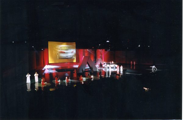 Este eventazo hubiera podido serlo más aún… Global Events propuso al cliente crear un escenario llenado de un líquido plateado en el cual el coche iba a nacer en varias fases hasta materializarse ante los ojos de los asistentes de forma sorprendente. El escenario era espectacular, la pantalla del fondo escénico era una caída de agua con proyección retro, que se completaba con dos pantallas de vídeo… y sobre este lago de agua plateada, plataformas hidráulicas permitirían que fueran subiendo componentes del evento, incluyendo el coche. Construyeron el coche en metacrilato transparente para que cuando la pintura cayera encima, fuera tomando la forma del coche y así desvelara el nuevo modelo. Además, buscaron un proveedor en Europa que pudiera fabricar un panel de plástico continuo, absolutamente transparente, de 20m de ancho por 6 de alto. Tenían así una capa de plástico delante del escenario, y los coches salían de la caída de agua y rompían el plástico. “Cuando proyectamos en retro sobre el plástico, con humo… esto hacía que el logo estuviera flotando” comenta Fermín. Al final no se realizó toda esta propuesta, se decidió no pintar la estructura transparente, por varios motivos complicados de explicar aquí, pero el resto se hizo, en esta presentación de coche de alto impacto.