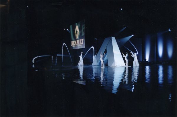 El concepto vino de la idea según la cual el fabricante no es nadie sin los concesionarios; los concesionarios no son nadie sin el fabricante, el público y la marca se escuchan mutuamente, es decir, todos son un reflejo del otro. Entonces tomaron el concepto de reflejo y lo presentaron de una forma muy espectacular. “Creamos un contenedor en el suelo del escenario, con el rombo de Renault cortado por la mitad dispuesto encima. Apagábamos la luz y enseñábamos que, si iluminabas desde arriba el agua, el rombo estaba incompleto, pero si iluminabas desde abajo, se veía el efecto de reflejo. Si has estado en los jameos del agua de Tenerife, ves el reflejo de las estalactitas y parece que sea un barranco”.