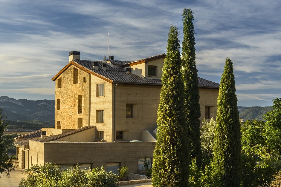 Para la rehabilitación de la masía se utilizaron materiales naturales de proximidad para reducir al máximo la huella de CO2 del edificio. Se emplearon elementos de construcción tradicionales utilizando técnicas modernas; como los muros de Tapial creados a partir de argamasa de tierra y paja de la propia finca, los suelos de yeso pulido de Albarracín, las paredes de arcilla y piedra arenisca de los Puertos de Beceite, los alicatados de mármol Macael almeriense o las estructuras de pino de bosques ibéricos. Todo elaborado por artesanos y constructores locales, convirtiéndose en un sobresaliente ejemplo de Economía Circular. Además, se ha conseguido crear un edificio con un bajo consumo energético, mediante la creación de corrientes de aire naturales e invernaderos interiores, y la utilización de materiales constructivos de gran inercia térmica. La escasa energía necesaria para el funcionamiento del hotel es 100% renovable a través de placas solares y calderas de la biomasa que se extrae de los pinares de la finca. Un proyecto eco sostenible tanto en su construcción como en su funcionamiento.