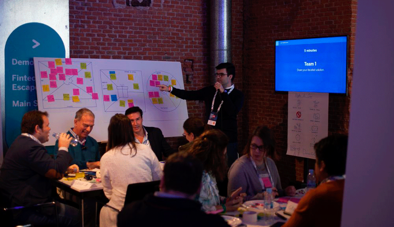 La idea era dar al evento un aire lúdico e informal y fomentar la interactividad de los participantes. Como el networking no surge por si solo Fazeta Producciones propuso ir a buscarlo montando una actividad relacional vinculada con la temática del evento. Así surgió la idea del Fintech Escape Room. Un espacio de escapismo integrado en el centro del evento, muy próximo al escenario principal en el que en grupos de 10 personas los participantes tenían que desafiar el reloj para poder completar una serie de pruebas de ingenio.