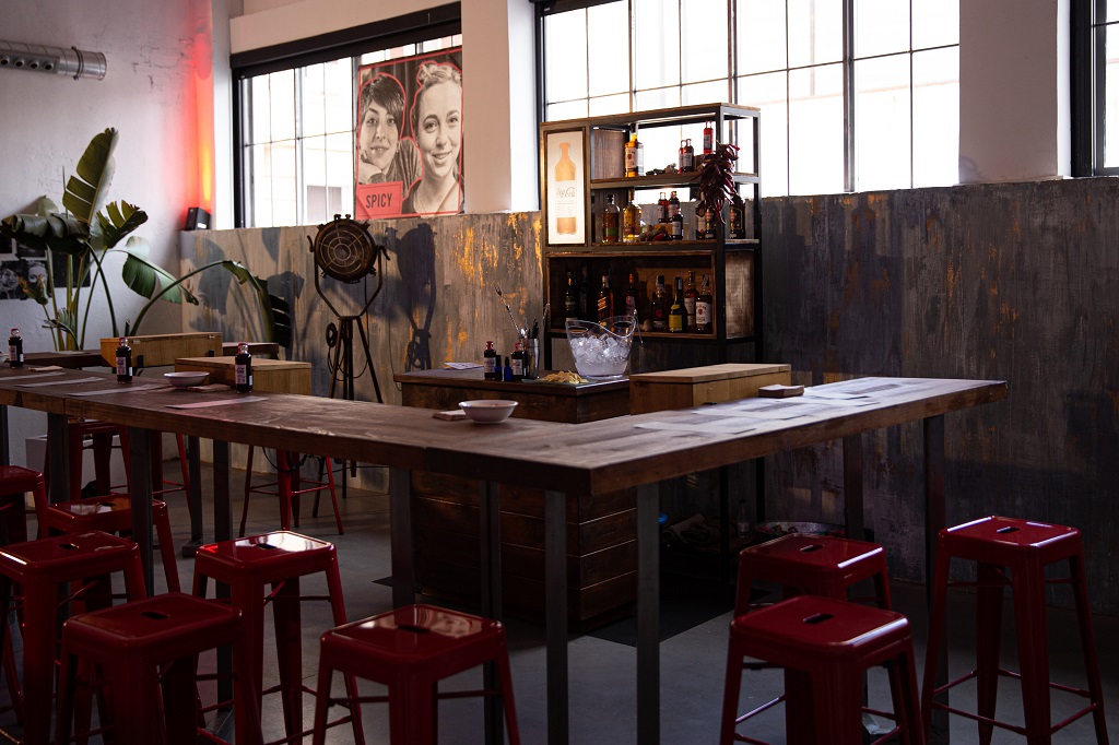 La experiencia iba en torno al bar. La esencia del producto de CocaCola se encuentra en los más de 200 componentes que conforman las diferentes versiones del mismo. Es por eso que, uno de los elementos clave de la presentación era crear un olor característico de cada uno de los corners de la muestra. Por ello, «el espacio se personalizó en base a sus objetivos», nos señala Cristian Cedena del Espacio Harley. Tenían claro que había que trasladar al visitante a un bar estilo tasca. Para ello, diseñaron el espacio en diferentes zonas de uso: dividieron en dos espacios la segunda planta del venue, y conforme iban llegando los grupos se iban repartiendo. ¿En total? Más de 200 empresarios del mundo hostelero pasaron por Espacio Harley para degustar los nuevos mixers de CocaCola. «La experiencia unía la gastronomía con un ambiente y aroma propio del producto presentado», recalca Cristian.
