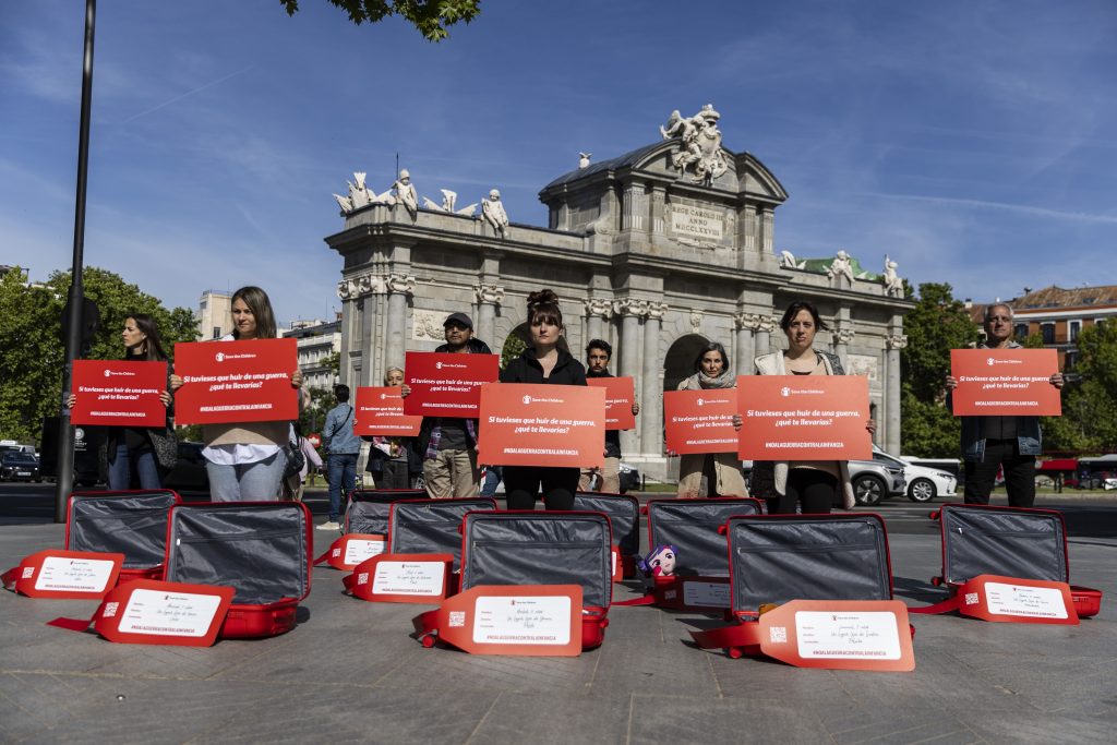 En esta acción en formato de flashmob, en la Puerta de Alcalá de Madrid, han expuesto maletas rojas para representar todo lo que las niñas y los niños en países en guerra desearían poder salvar al tener que huir de sus casas. Según datos de Save the Children, en 2023, cada día unos 29.000 niños y niñas se vieron obligados a abandonar sus hogares en los principales escenarios de crisis del mundo, con un total de más de 10 millones.