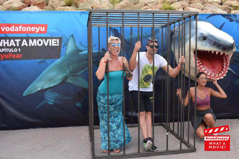 Y con esta filosofía la agencia Flash2Flash estrenó el primer capítulo de Vodafone yu What a Movie! en las Cuevas del Almanzora, Almería. Con el título de #yuFear los asistentes vivieron la proyección de una película sobre tiburones con una pantalla sobre el lago y flotadores en lugar de butacas. Y claro, durante la proyección la película cobró vida alrededor de los espectadores: una aleta de tiburón paseó amenazante entre los flotadores del público, una moto de agua pasó a toda velocidad junto a los asistentes, una invitada sufrió un ataque del escualo. Y una lancha explotó ante los incrédulos ojos de las 200 personas que vivían la película como protagonistas de la acción.