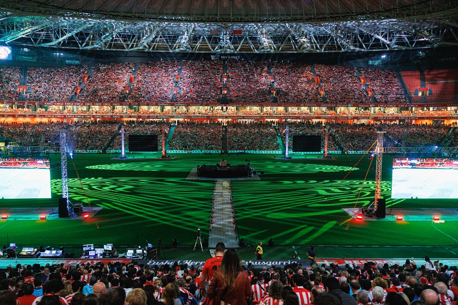 Además del reto del césped – se trazaron pasarelas sobre el mismo para que no se estropeara por donde pasaban personas y máquinas -, otro fue integrar las señales de audio en las propias pantallas del estadio con las pantallas del evento, así como integrar la iluminación con la del San Mamés, los marcadores, etc. Y por supuesto el tema de contenidos y la inclusión de los seis patrocinadores del club. Una amalgama de acciones que Innevento había condensado en el hashtag #You’reUniqueintheWorld que fue el hilo conductor de toda la propuesta.