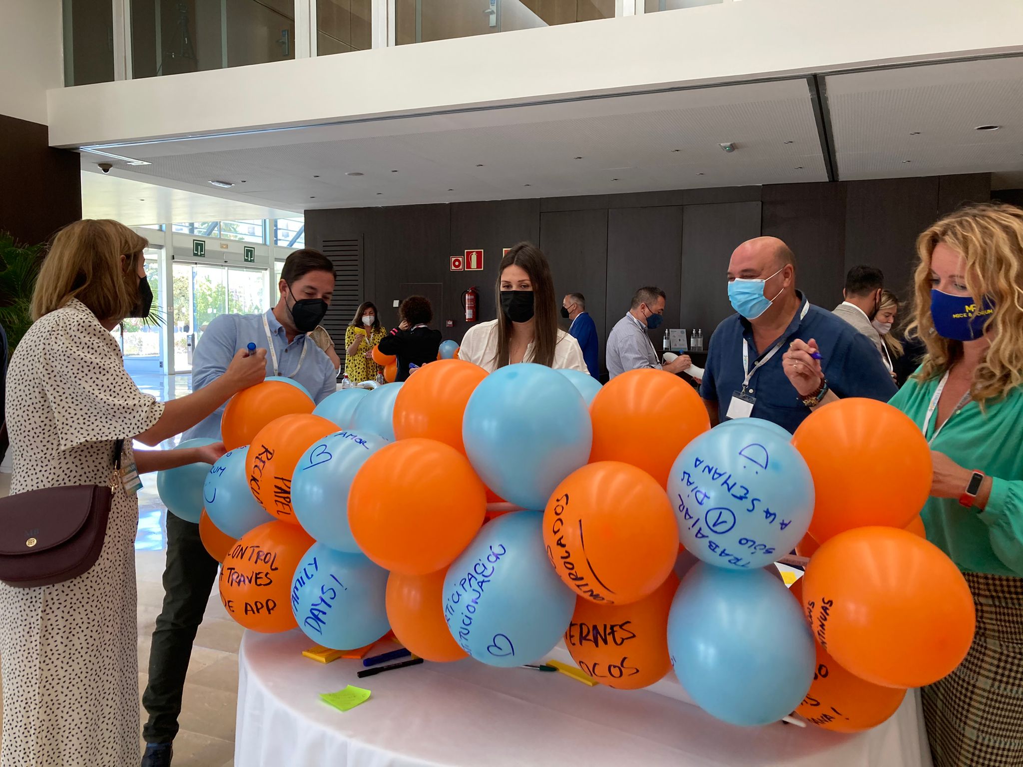 Con todas las medidas de seguridad e higiénico-sanitarias de por medio, y divididos en equipos, y ayudados por David Serrano, coach y CEO de la productora, y varios facilitadores, “entre todos aportamos nuestras opiniones e inquietudes, así como las soluciones, ideas y nuevas oportunidades que el nuevo mapa del sector nos había dejado tras la pandemia”, nos señalan desde Es.Cultura Eventos. Luego se discutieron y apuntaron en los globos que, como colofón, formaron una cadena ADN MICE de más de 15 metros.