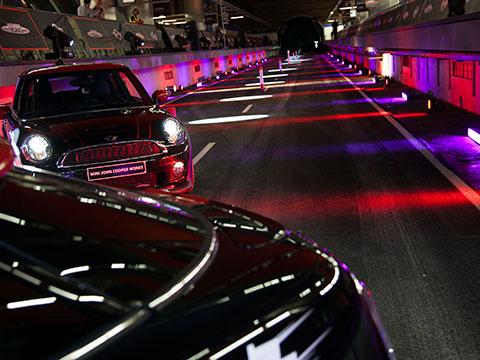 Un semáforo de carreras a punto de cambiar a verde en la boca del túnel, humo blanco saliendo de los túneles generando expectación sobre lo que está por aparecer en la pista, y una atronador rugido de motores dieron el pistoletazo de salida de este espectacular evento presentación de los modelos Mini John Cooper Works.