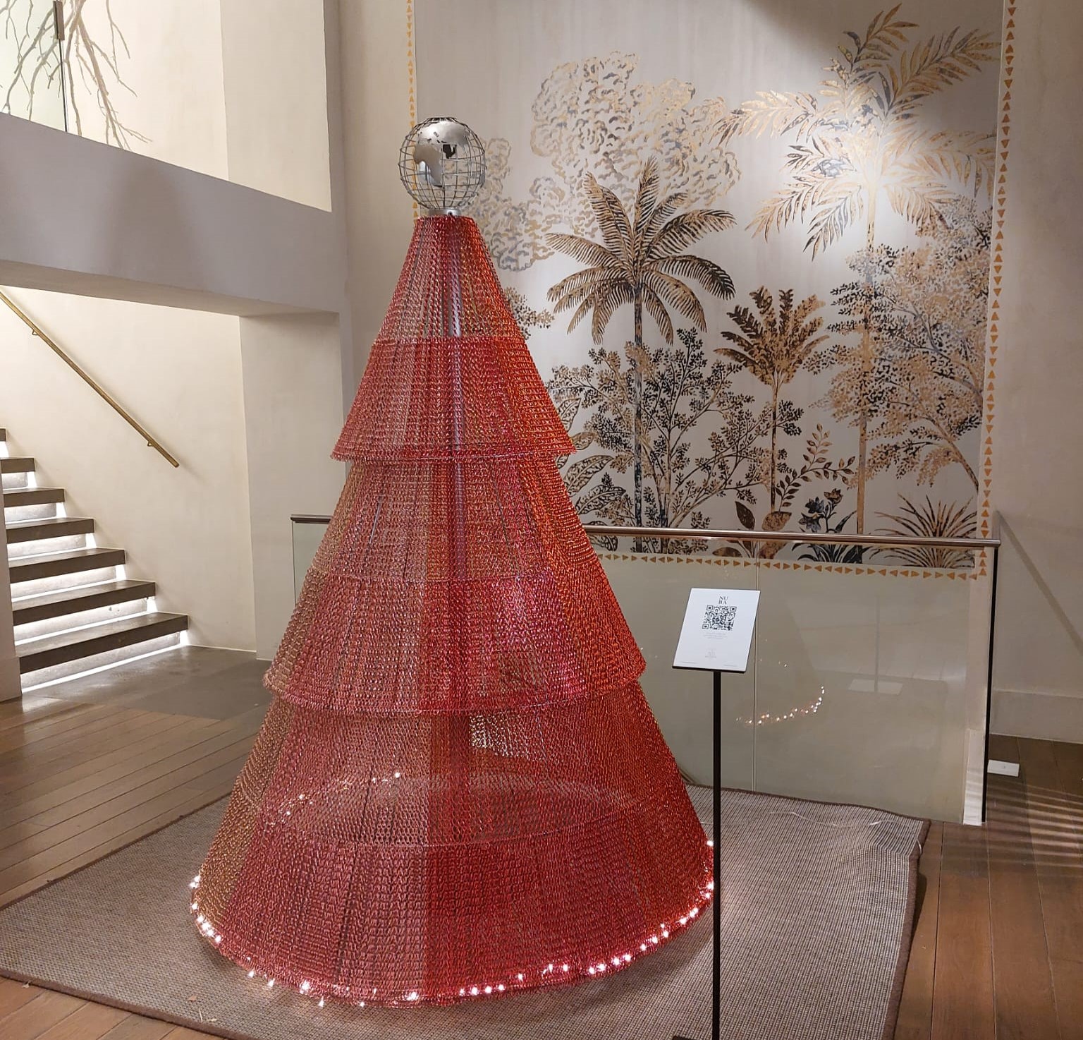 La arquitecta e interiorista, Teresa Sapey, diseñó del árbol de Navidad ubicado en el centro del evento y creado para la ocasión ad hoc. Se trata de una pieza compuesta por tres estratos de cadenas de colores que generan un degradado que juegan con la luz. “Los viajes unen a personas de diferentes culturas, enlazándolas para siempre”, nos señalan desde la agencia. Las cadenas representan la unión, el enlace entre las personas, los lugares y la cultura, así como la conexión global que generan los viajes entre las personas.