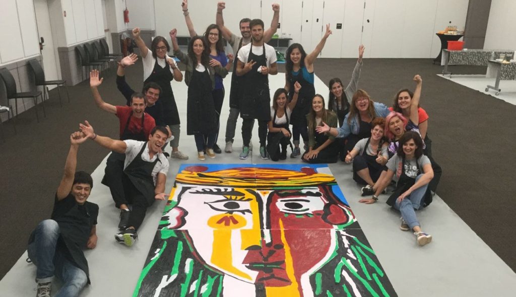 Después, comenzaba una actividad que gustó mucho: por grupos deberíamos reproducir el Retrato de mujer con sombrero de Picasso en cuatro grandes lienzos de tela realizados cada uno por un grupo diferente. Los cuatro lienzos juntos formaban un todo de 8m2. La idea era colaborar, y en pocos minutos se definieron los mezcladores de colores, los compradores de pintura, los delineantes y los ejecutores, un trabajo de equipo impecable… Después de esta sesión, debrief moderado por Amfivia donde sacamos todos muchas conclusiones y paralelismos sobre cómo podemos trabajar. Y salió el sol, por lo que, de premio, comida de despedida en la terraza del hotel.