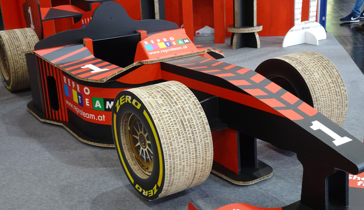 El cartón estructural impreso (use & throw) sigue fuerte como elemento constructivo en stands, mobiliario y como vemos aquí, en la decoración y creación de maquetas de productos.