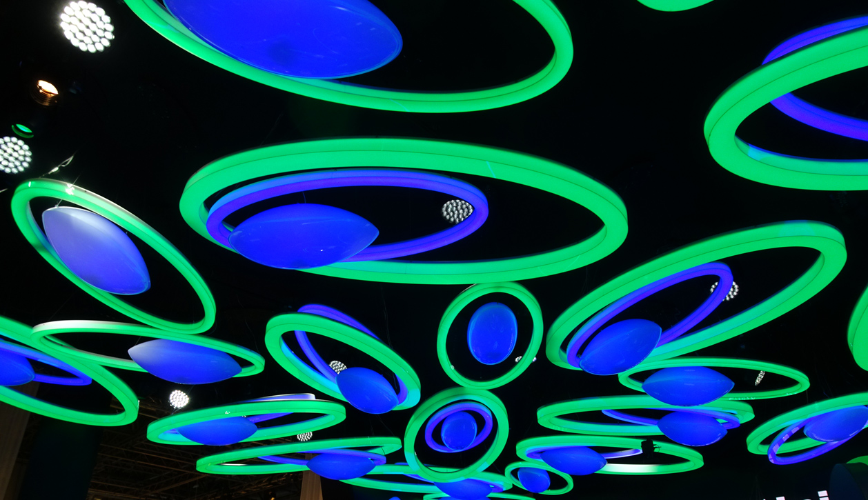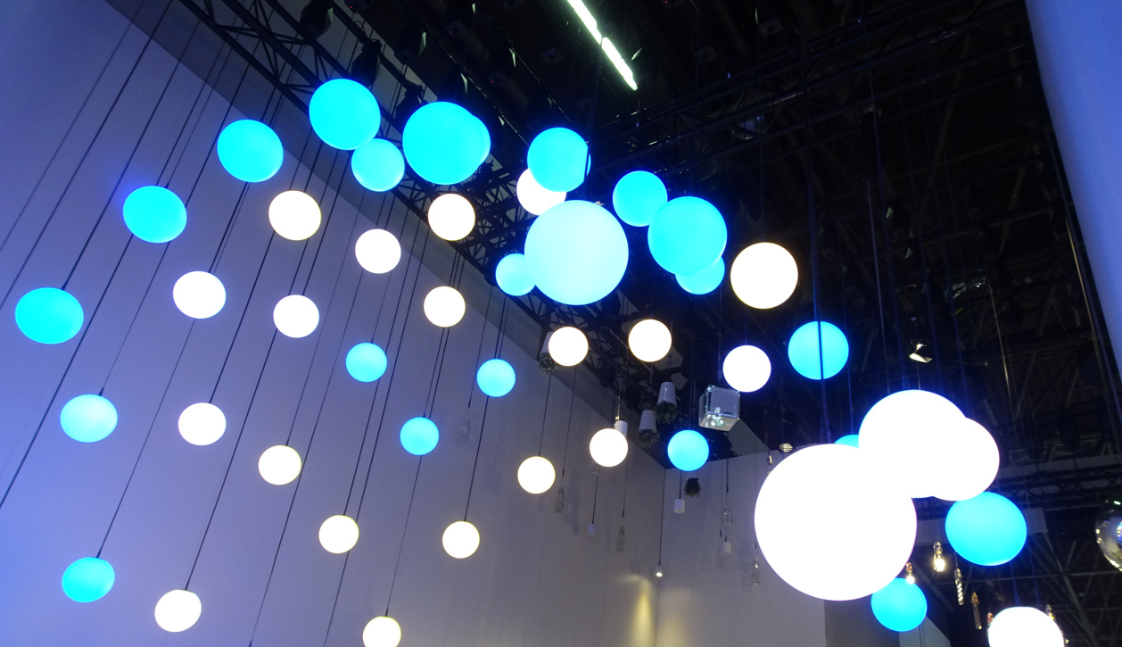 Aquí unas elegantes lámparas esféricas con un mecanismo que permite subirlas y bajarlas, además de cambiar de color. Una decoración dinámica y atractiva. Kinetic Lights tiene esferas y otros elementos que se controlan creando mallas en 3D.