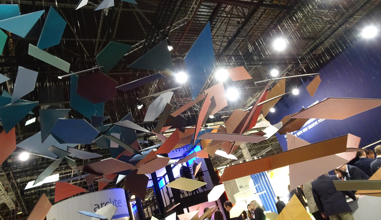 Sin duda la tendencia de decoración más nueva; prepárate para ver esto en los próximos años: estas combinaciones de formas geométricas variadas, sorprendentes, que hemos visto tanto en paredes como colgadas del techo, han estado por todas partes en la feria. Aquí una selección…