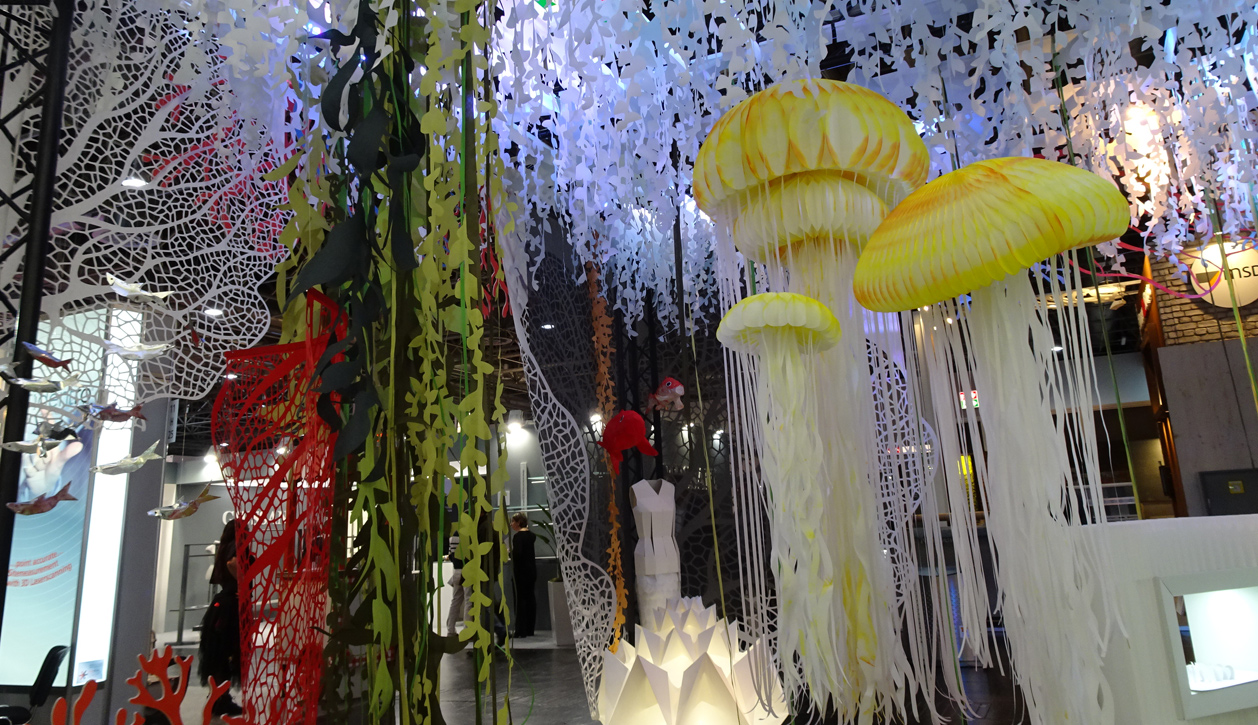 El stand de Procédés Chenel pone en escena la creatividad de la empresa y sus soluciones de decoración con papel, poniendo en escena el tema del stand: “Sumergete en el mundo Chenel Underwater, mundo marino….”