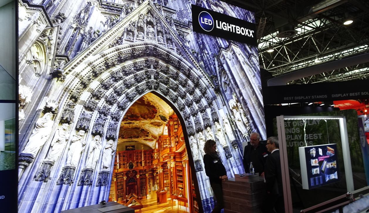 La impresion no ha muerto, ni mucho menos. Al contrario, actualmente, con resoluciones muy altas y telas tensadas de alta calidad, se consigue una decoración impactante con poca inversión. Aquí, un stand pone en escena esta tendencia con tela de retroproyección. Otro detalle interesante: utiliza un sistema de perfileria de aluminio y textil con perímetro de silicona, que es una opción muy económica para grandes decorados.