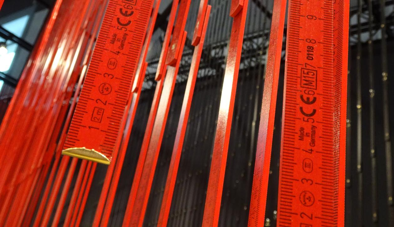 Sorprendente, elegante, algo nostálgica, esta decoración a base de reglas de madera rojas colgadas del techo. Una forma de comunicar arte, artesanía con un toque vintage.