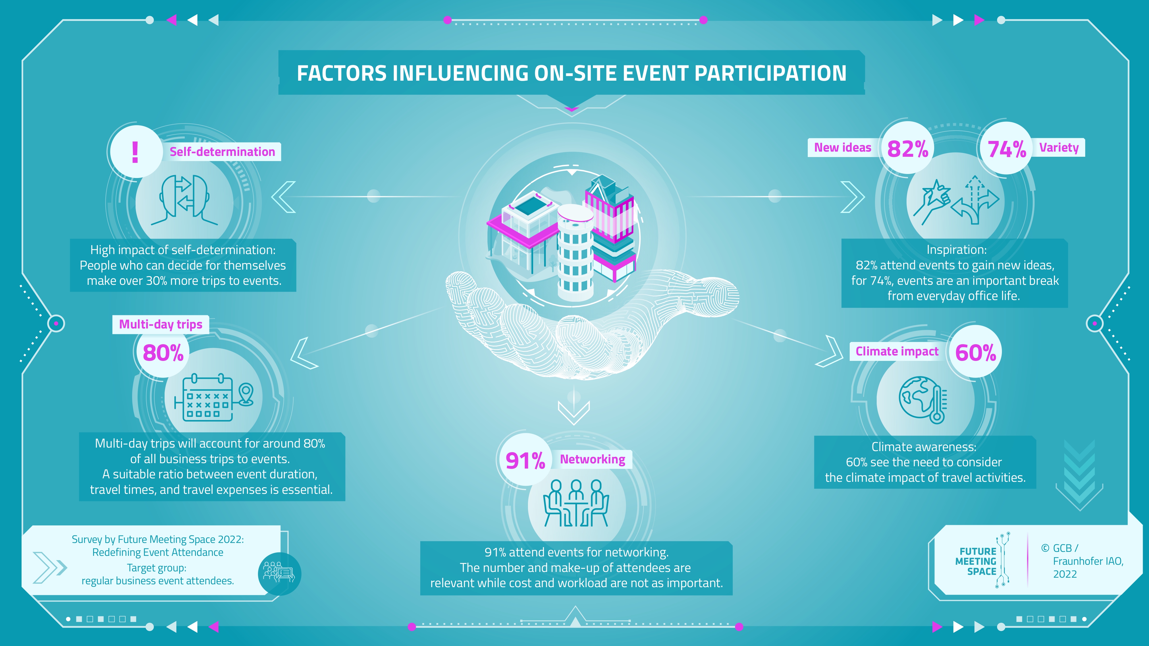 The current research phase of the FMS innovation network is therefore analysing which occasions, motives and reasons speak for or against attending in-person events. The results of the first survey show that networking and gaining new ideas are the top reasons for attending events in person in the future. The survey also confirms that self-determination has a significant impact on event attendance, i.e., people who can decide themselves if they attend events do so more often than people who require approval for their business trips. Moreover, in the long term, multi-day trips will account for around 80 % of all business trips related to attending events.