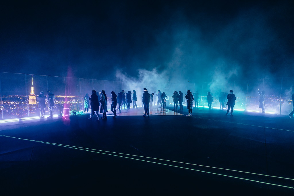 The experience is called Skylight and is a nightly, immersive light display evoking the Northern Lights. It was a temporary event at Edge, from March 3 to 7, 2022. The idea was to experience the aurora borealis over the skyline of New York, in a 360-degree experience over the city. The show and experience used revolutionary lighting technology to create dramatic illustrations over the NYC skyline. Each 20-minute show featured dynamic, dancing waves of light illuminating the entirety of the deck, and provided the perfect backdrop for content generation by guests (selfies and more…).