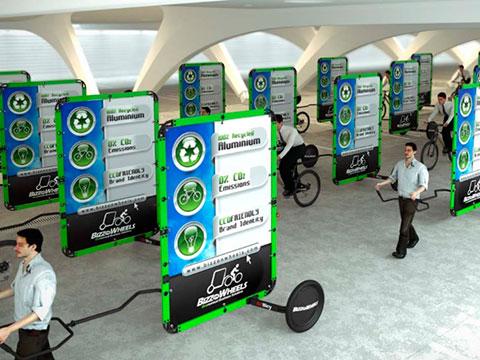 El AdBicy, comercializado en España por {ms_2193}, consiste en una estructura sobre ruedas en la que se pueden encajar varios paneles, y su versatilidad puede ir desde utilizarlo como un stand a soporte de proyección en espacios cerrados, como ferias o congresos.