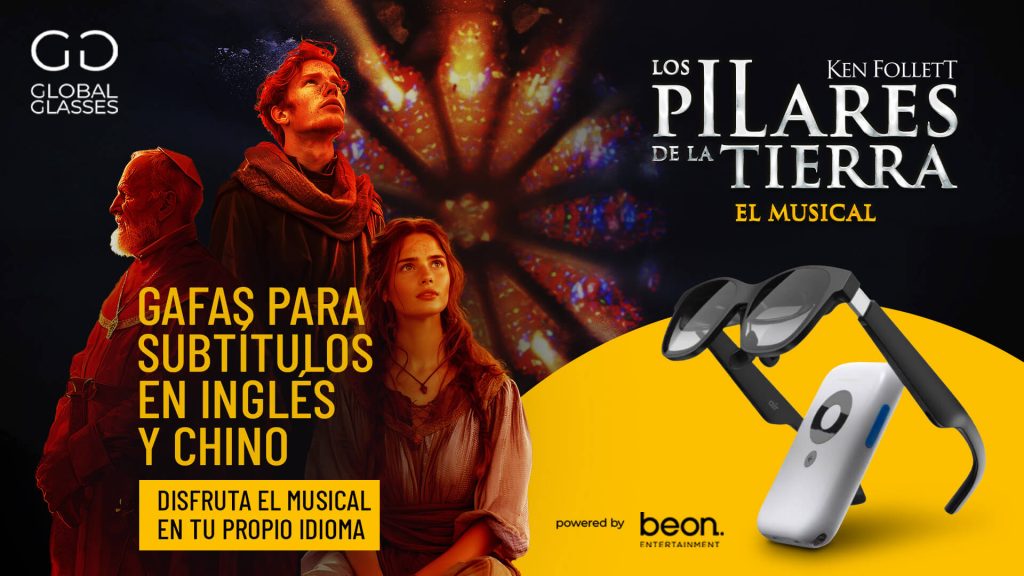 beon. Entertainment estrena este dispositivo con la traducción al inglés y al chino de Los Pilares de la Tierra, el musical, a partir de noviembre en el Teatro edp Gran Vía de Madrid. Antes de finales de año estarán también disponibles en italiano, alemán y francés.