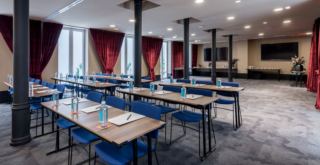 El hotel ofrece tres salas para desarrollar una presentación, evento corporativo o una reunión. La ‘sala Mallorca’ de 102m2 y capacidad para 90 personas, cuenta con luz natural y acceso directo al patio; la ‘sala Roma’ un espacio perfecto para reuniones más pequeñas y acogedoras, cuenta con 70m2 y capacidad para 70 personas; y la ‘sala Alba’ que gracias a sus 170m2 permite que las reuniones no se queden pequeñas, ya que caben hasta 240 personas.
