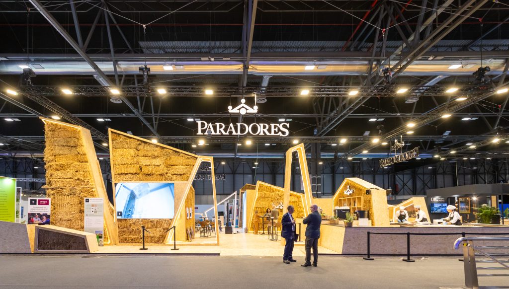 Paradores ha participado en FITUR con un stand donde la paja es el principal material de construcción sin recurrir a impresiones ni pinturas sintéticas, según nos explican desde Paradores. Una estructura que, una vez desmontada después del certamen, nos dicen que, servirá para la creación de huertos ecosostenibles.