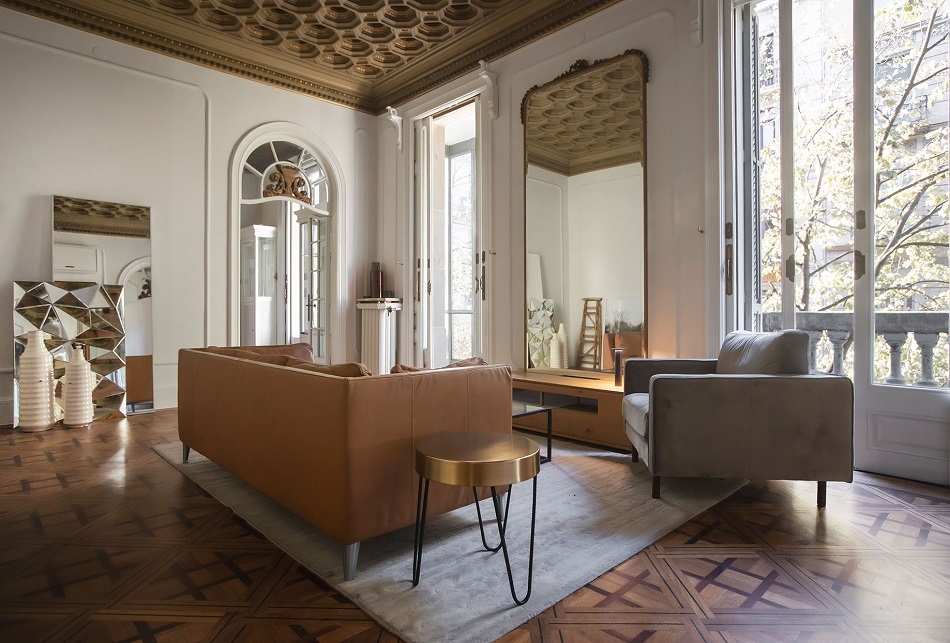 Componen este espacio de paredes blancas cuatro salas con vistas al Paseo de Gracia: una habitación de matrimonio con una gran bañera móvil, una sala con vitrinas, un gran salón comedor y un despacho. Las paredes blancas de casi todas las salas son un básico para la mayoría de estilos por su compatibilidad y estética, y contrastan con el suelo laminado dándole mayor protagonismo. Una combinación muy equilibrada que consigue a pesar de su personalidad, crear un ambiente neutro que permite cualquier creatividad específica del evento.