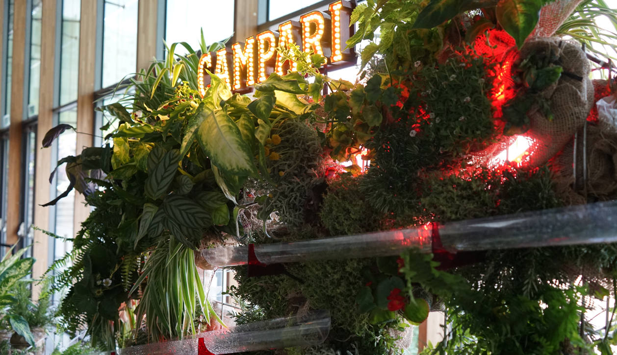 La combinación de lo natural y lo artificial se proponía como un juego compositivo entre elementos, partiendo de la idea de que Campari es una bebida que se obtiene de la infusión de hierbas amargas, plantas aromáticas y frutas, que resulta en una bebida con un color rojo vibrante. Diferentes retículas metálicas ordenaban la vegetación salvaje, como una metáfora entre lo emocional (la naturaleza) y lo racional (la cuadrícula).