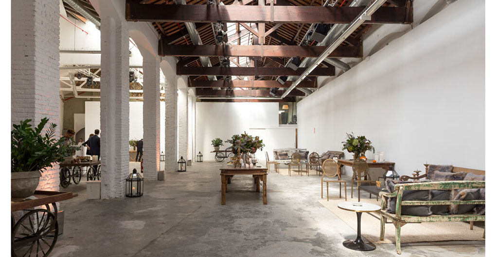 Una antigua fábrica madrileña de cristal del siglo XX convertida en un espacio para eventos que combina elementos del local original con un toque modernos. Las paredes y los suelos son huella del taller en el que trabajaban los artesanos y ese aire industrial contrasta con la luminosidad que entra por el lucernario que corona toda la estancia.