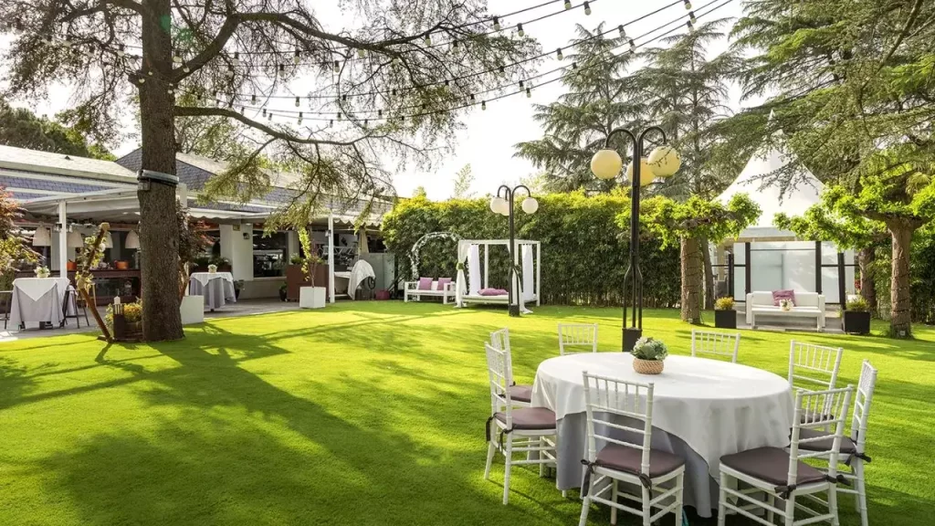 Si quieres organizar un evento al aire libre en Madrid, ten en cuenta las fincas que se encuentran en la periferia de la ciudad. A 15 minutos del centro, en Pozuelo de Alarcón, se encuentra UZalacaín La Finca. En su jardín, de 1.300 m2, se pueden reunir hasta 820 personas en formato banquete o 1.200 en cóctel.
