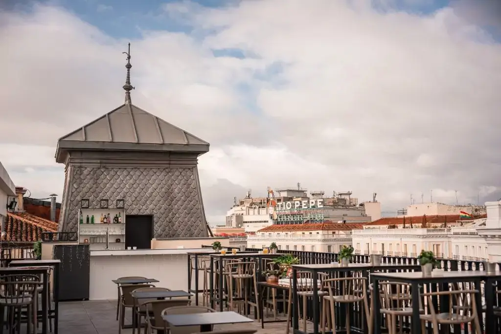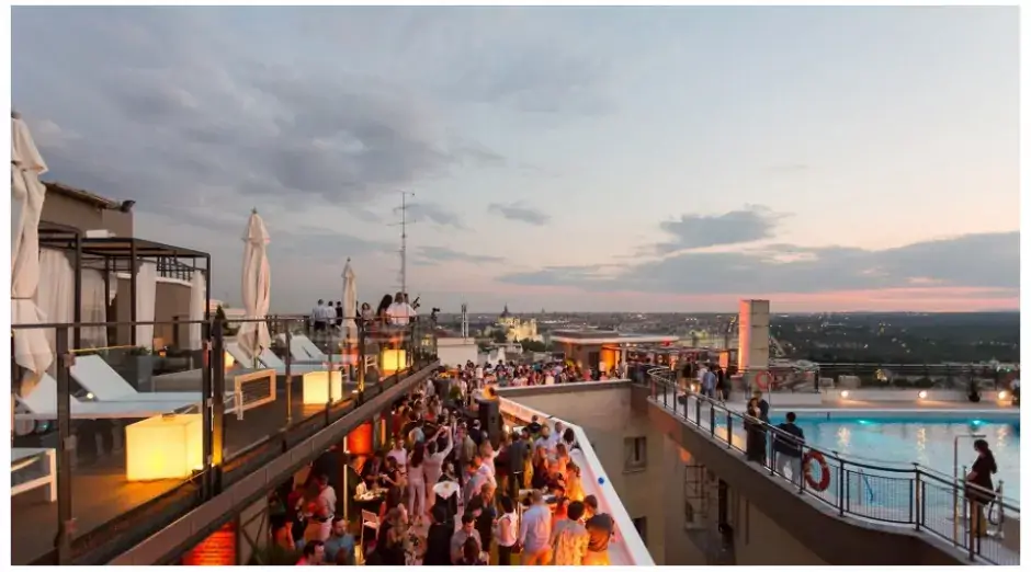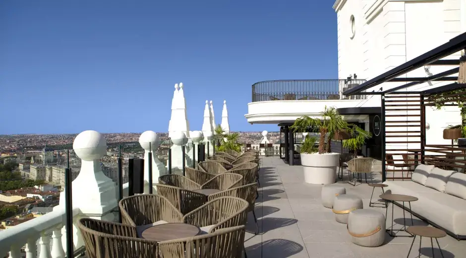 Uno de los rooftops preferidos tanto por turistas como por los madrileños, la terraza del Hotel Riu Plaza España, conocida como 360º Rooftop Bar, se encuentra en la planta 27 del edificio y ofrece unas vistas panorámicas de 360 grados de la ciudad. Este espacio cuenta con una superficie de 570 metros cuadrados y puede albergar hasta 450 personas en formato cóctel. Además, dispone de una pasarela de cristal suspendida a 100 metros de altura. ¡No apto para personas con vértigo!