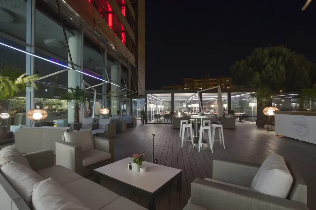 Ni una ni dos: el Hotel Puerta América Madrid dispone de tres terrazas en las que organizar eventos. En la planta superior se encuentra Skynight Lounge, una terraza que ofrece vistas panorámicas de Madrid. Situada en la planta baja se halla Liquid 41, con capacidad para hasta 150 personas en formato cóctel, piscina y zona de sillones. Además, las salas de reuniones diseñadas por John Pawson disponen de una terraza privada que puede utilizarse para recepciones y cócteles.
