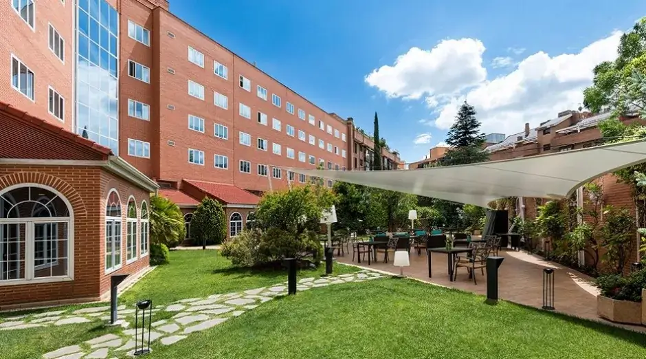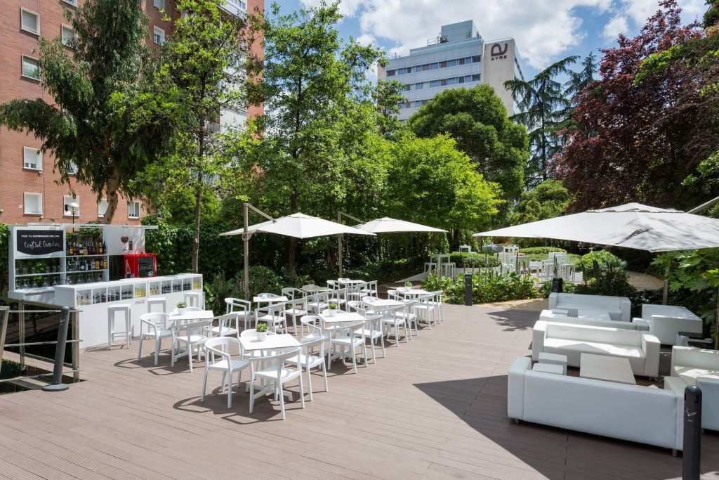 A tan solo 15 minutos en metro del centro de la ciudad, en la conocida y animada Calle Alcalá y próximo a todas las famosas atracciones de Madrid, el Hotel Elba Madrid Alcalá dispone de amplio jardín-terraza de 1.300 metros cuadrados. Un espacio versátil y natural en el que podrás albergar hasta 900 personas en formato cóctel y 680 personas en banquete.