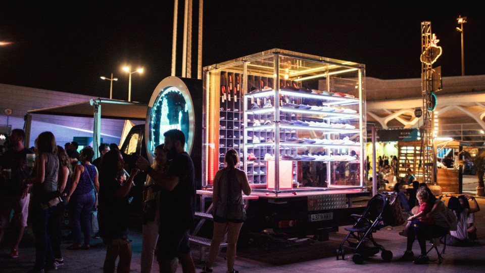 Descontextualizando el ir de compras y metiéndolo en un entorno de ocio como los festivales, donde el target se encuentra en modo lúdico, y a su vez acercando el e-commerce de la marca a un entorno físico, este foot truck estaba formado por un cilindro con el logo de la marca y un cubo transparente a modo de escaparate. El cilindro interactuaba con el público a través de tecnologías de captura de movimiento haciéndolo partícipe de una performance en la que se intercalaban campañas y características del producto. Ambos –cubo y cilindro- se sincronizaban además con el ritmo de la música del festival mediante el juego de luces y vídeo.
