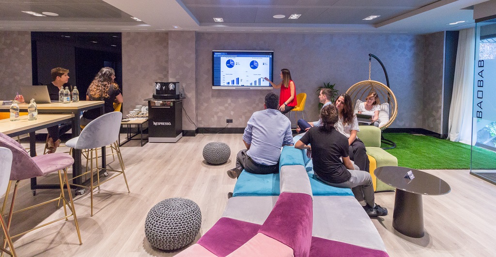El ambiente y diseño de la sala también está enfocado a fomentar un entorno agradable de trabajo, aprendizaje y networking. Desde luz natural con vistas a una zona ajardinada del hotel, césped artificial en el interior a modo de acogedora alfombra, hasta mobiliario modular que combina mesas grandes con más pequeñas, sofás o escritorios de pie. Todo ello con una paleta de colores en los que predominan los verdes, naranjas, amarillo y azules para favorecer la energía, creatividad y reducir el estrés.