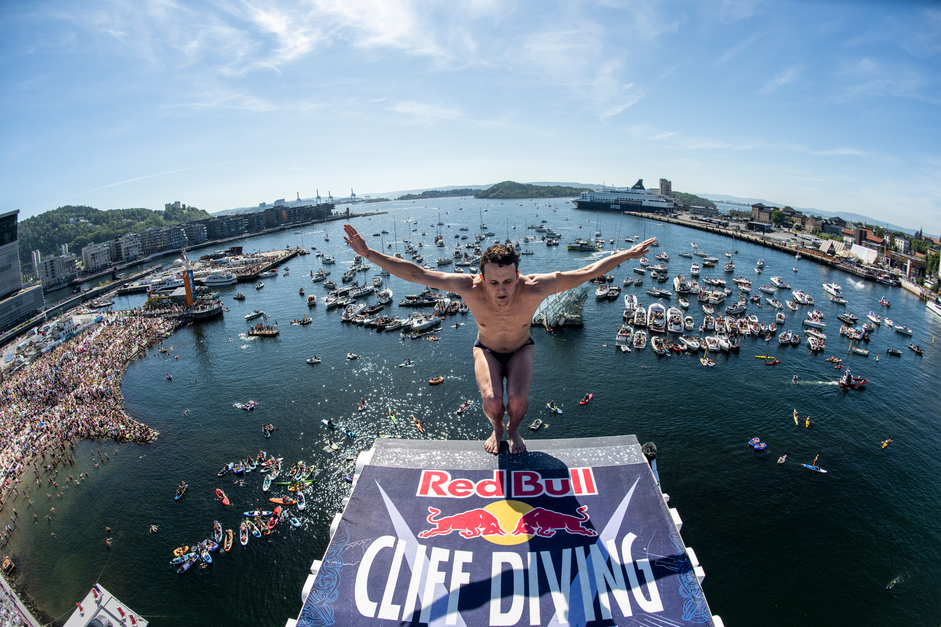 Red Bull lleva tiempo diseñando retos extremos deportivos para posicionar su marca: en esta ocasión, Aidan Heslop (del Reino Unido), se sumergió desde la plataforma de 30m en la Ópera de Oslo durante el último día de competencia de la cuarta parada de la Serie Mundial Red Bull Cliff Diving en Oslo, Noruega, el 13 de agosto de 2022.
