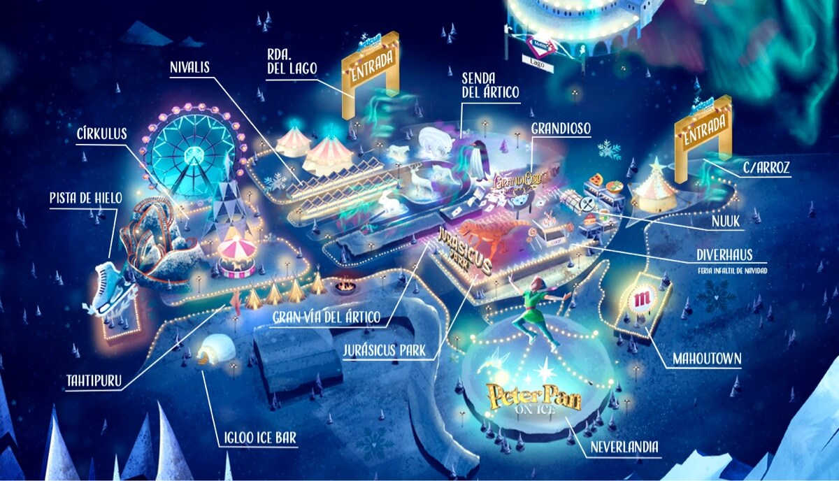 Árticus es el pedacito más divertido del Ártico ¡pero en Madrid! Más de 100.000m2 de Navidad con paseos llenos de luz, atracciones donde soltar adrenalina, espectáculos mágicos como ‘Peter Pan on Ice’, un mercado navideño de cuento, una pista de hielo para no parar de deslizarte, animales polares y hasta prehistóricos, auténticas Auroras boreales ¡y mucho, mucho más!