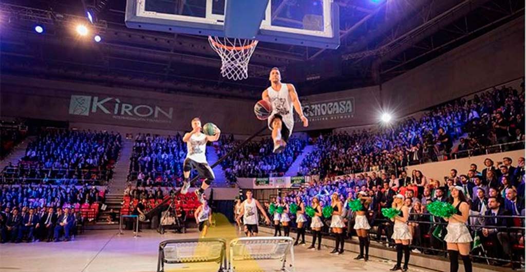 Marcando triples y mates en la convención de Tecnocasa. La agencia LaOrganización se encargó de montar este evento que reúne a las tres marcas del grupo (Tecnocasa, Kirón y Tecnorete) y a la que acuden 3.500 personas de diferentes países. Con el lema ‘La fuerza de un grupo’, la agencia contó con Creartys para intercalar en las sesiones un espectáculo vinculado con el deporte en el que prevaleciera el trabajo en equipo. Se necesitaban mostrar los beneficios de trabajar en equipo, la pasión a la hora de realizarlo y las victorias profesionales alcanzadas en esta línea. La propuesta fueron los Dunkers Locos, un equipo de deportistas especializados en baloncesto acrobático que con el estilo de jugadores de basket de la NBA y armados de colchonetas y camas elásticas metieron a los espectadores en un espectáculo de baloncesto. Un show que integraba deporte, diversión pero también se podía ver en acción cómo para rematar un mate espectacular todos los miembros del equipo colaboran en el salto poniendo en movimiento el balón, pasándoselos, ayudando y coordinándose en los saltos y tirabuzones hasta que el último jugador culmina encestando.