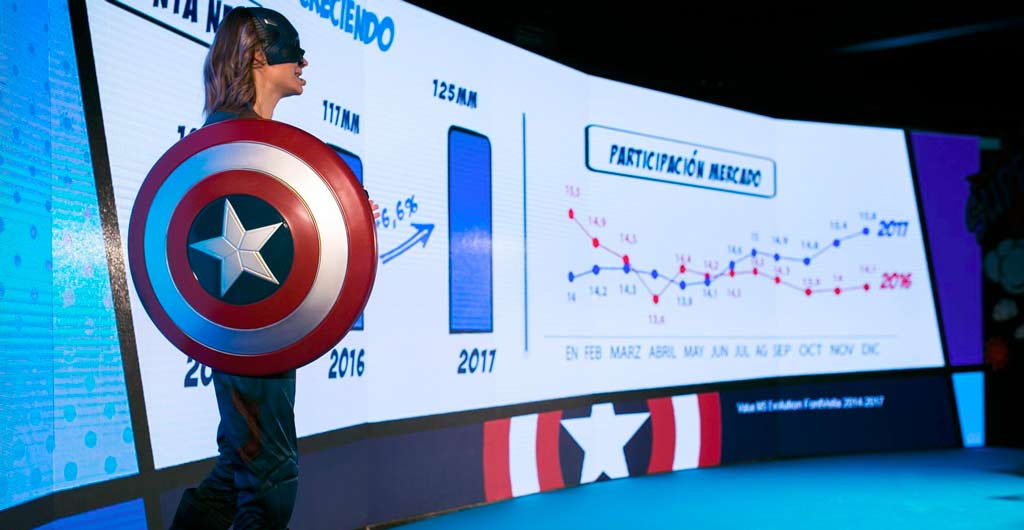 ¿Una comic-con o una convención con superhéroes? Todos nos hemos sentido en algún momento con una energía de ‘superhéroe’, una vocecita interior que nos decía que todo era posible, que nadie podía con nosotros. Imagina el poder de esta sensación y el número de guiños que puedes hacer en la empresa si tu convención consigue transmitir esta actitud “no limits”. Utilizando este poder, bajo el claim ‘Supérate’, la agencia Unit Elements preparó la convención de ventas de una multinacional del sector de la alimentación, dirigida a más de 210 personas de todos los sectores de la empresa. En este evento, entraron de lleno en el imaginario de los superhéroes y aprovecharon la creatividad del mundo del cómic. De esta forma, cada ponencia presentaba a un superhéroe distinto que se unía a una batalla contra un terrible villano. El guion y los contenidos se adaptaron al máximo con el superhéroe y sus ‘superpoderes’, construyendo una narrativa que reforzase los mensajes principales, y con un dibujante profesional se hizo la decoración de todo el evento y las presentaciones.